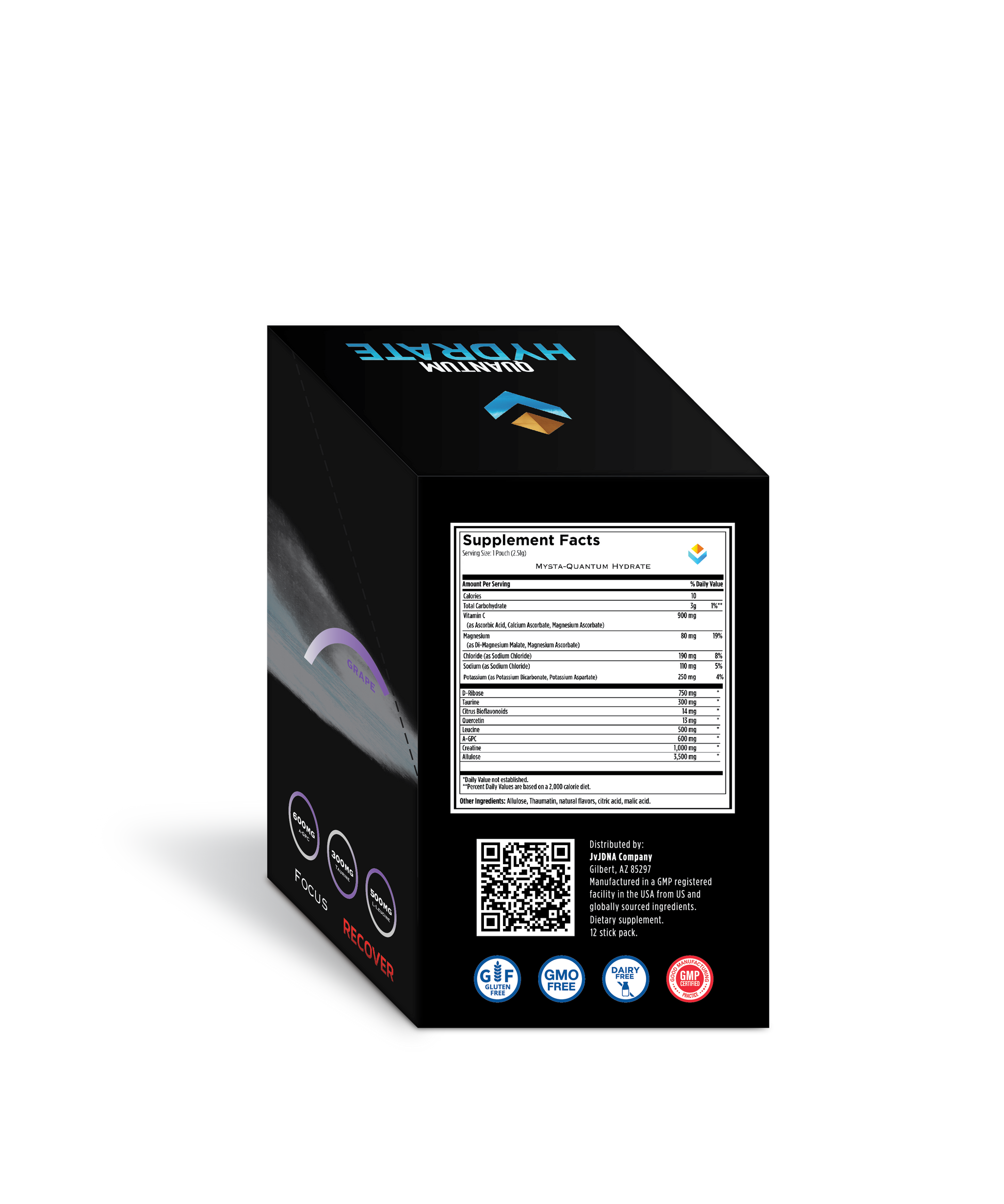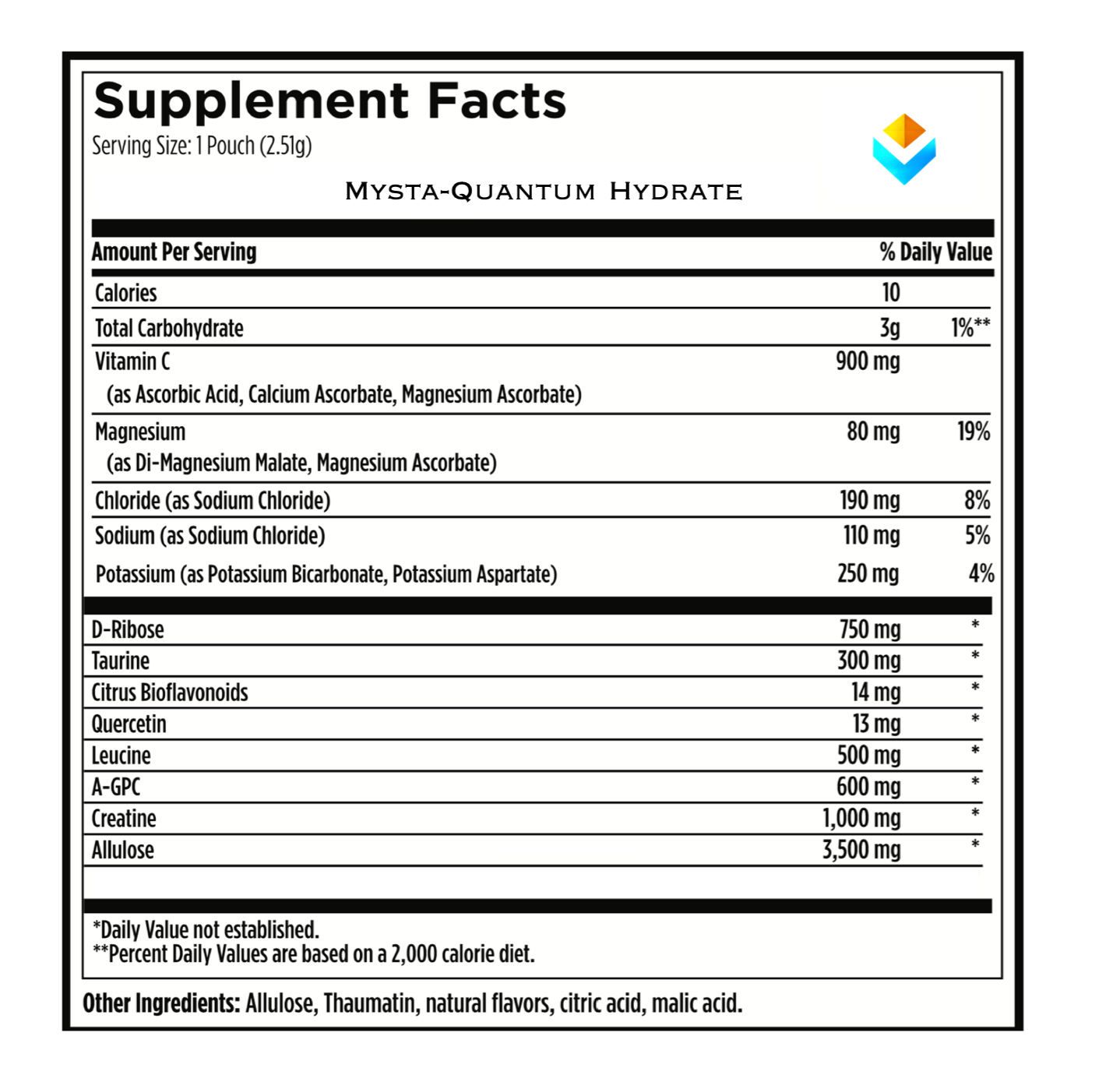 MYSTA QUANTUM-Hydrate is a complete and balanced electrolyte formula, now with A1C stabilizing Allulose , which helps promote Cellular Hydration, especially after excessive sweating.* It contains potassium, sodium, chloride and magnesium, the main electrolytes found in the body. D-ribose is included because of its importance in healthy cardiac function. MYSTA QUANTUM-Hydrate is a complete and balanced Electrolyte Formula, now with A1C Energy stabilizing ALLULOSE , the pure FOCUS nootropic A-GPC , Creatine & Recovery Amino Acids Leucine and Taurine all in One Stick!